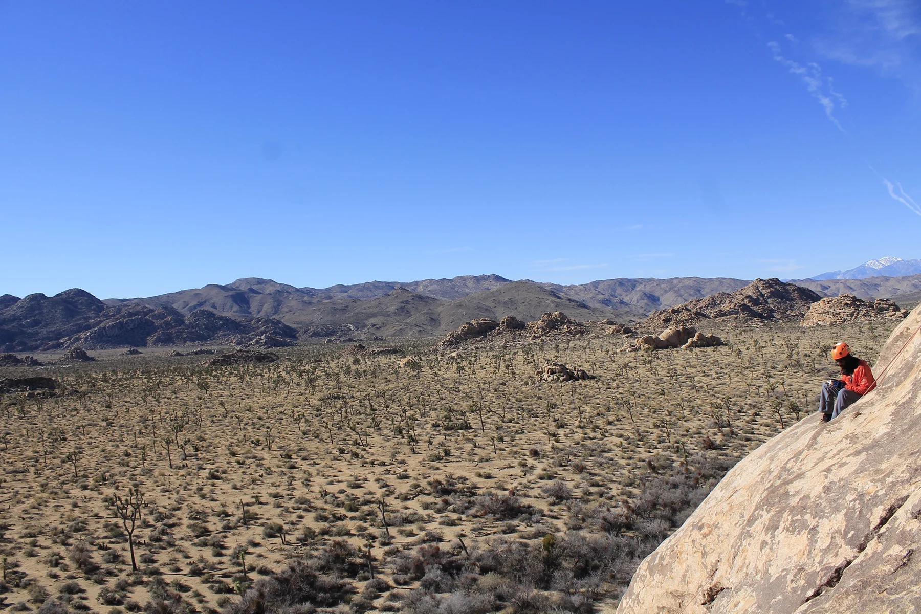 Edgar — The morning of the second day was a low point in the trip, pretty much for everyone. My energy was low and I was not excited to climb. Even though the sun had risen, it was still very cold. It also did not help that the climbing wall was in the shade, depriving us of the luminous desert sun. I felt cold-blooded and sluggish from lack of warmth. It was a relatively easy day in terms of activity. The climb site was a short hike from camp. I could see it when I walked up the hill that our camp was tucked against. It’s only initially that a new environment seems foreign. I felt like a coyote cub emerging from its den eager to investigate the surrounding desert. At moments I lamented being tied to the group and having such a tight schedule. I felt the urge to explore all the hidden nooks and crannies that I know exist somewhere in the desert, the places hidden away from the pounding gusts and frigid cold. I wanted to be free to roam the desert. Somehow it didn’t seem so large the second day and gradually the land around me began to shrink. Or was it that it was expanding? I no longer cared. After the climb, we raced against the sun to squeeze in a boulder scramble. Walking in a tight line, we made our way up the hill. It was a fun climb and we made it to the summit shortly. The view revealed the desert valley around us. I have always been interested in navigation and quickly made a mental note of the key landmarks in the area. This allowed me to developed a mental map of our camp. It was then I realized we had taken baby steps away from civilization.