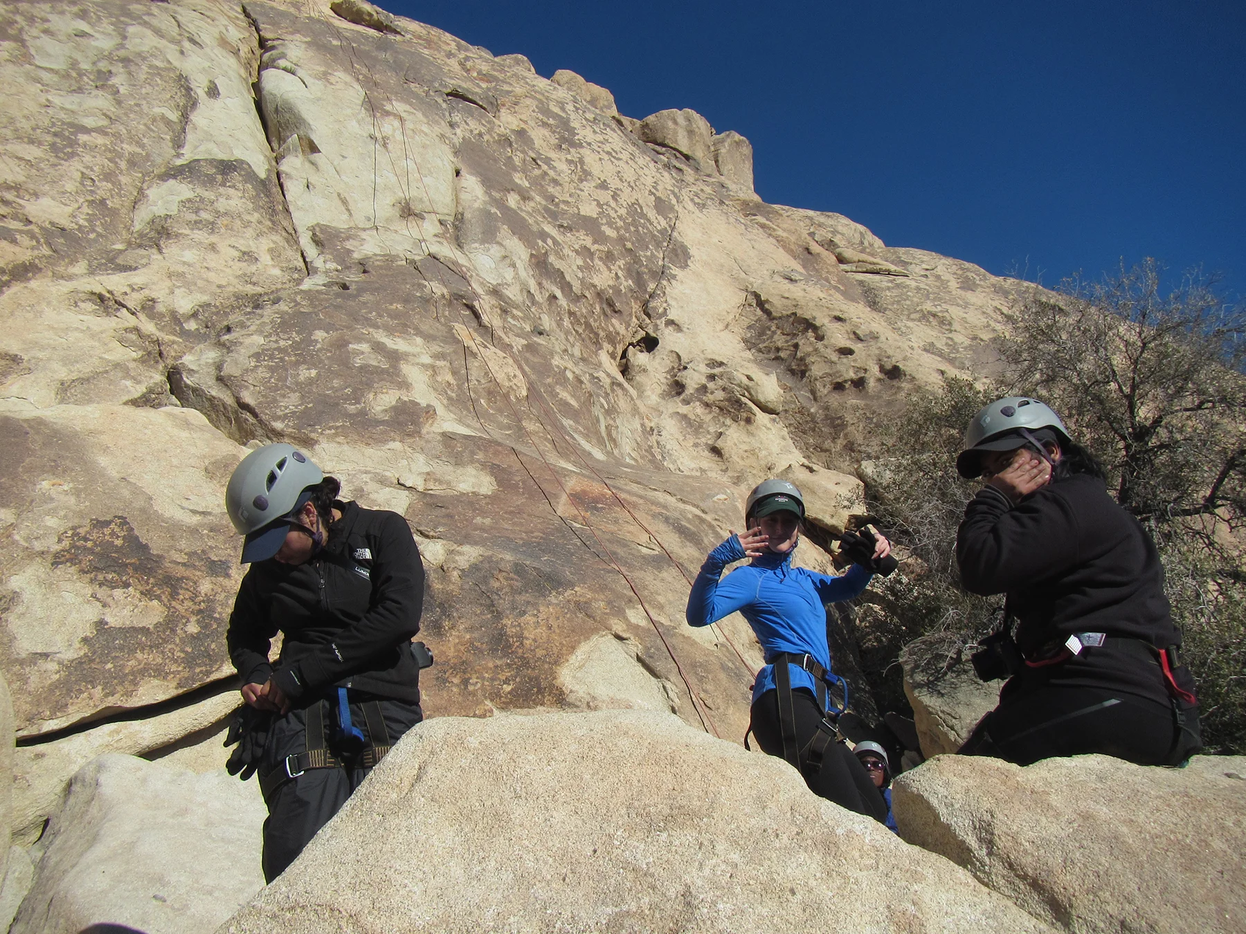 Ingrid — The desert announced it was morning by shining its bright light onto my face. I got up and immediately felt pain in my feet. It was a weird type of pain, my feet felt cold and numb to the point it hurt to stand or walk on them. I threw on my hiking boots and ran around camp —that didn’t work. I entered the shelter and removed my shoes and socks in hopes to warm up my feet using my hands. I was shocked once I saw my feet: red, white, pale blue like a weird American flag. I asked Jamie, who happens to be an EMT worker, to describe the symptoms of frostbite. She informed me that the skin looks like candle wax with reddish borders. I responded, “Yup, I think I have first degree frostbite.” I was told in the beginning of the course that cotton retained moisture, so we were only allowed to wear wool. I didn’t listen because I assumed that if I layered 3 pairs of socks it wouldn’t matter if one of them was cotton. It mattered. As soon as I took those evil socks off my life got instantly better. Later that day, it was time for the first day rock climbing. I sat out most of the time. I was too busy mentally and physically preparing myself. Mentally because I’m afraid of heights, and physically because my body was so cold it felt immobile. After lots of contemplation and running in place I was ready to go. D-Low volunteered to be my belayer (the person responsible for your rope and safety while you’re climbing) because I showed signs of uncertainty. I made it about 10 feet up without thinking. I wasn’t able to make it to the top, but I was able to challenge myself in trusting my belayer and the rope. When it was time to go back to camp I kept thinking to myself, I should’ve taken advantage of this opportunity. I promised myself I would climb more the next chance I got.