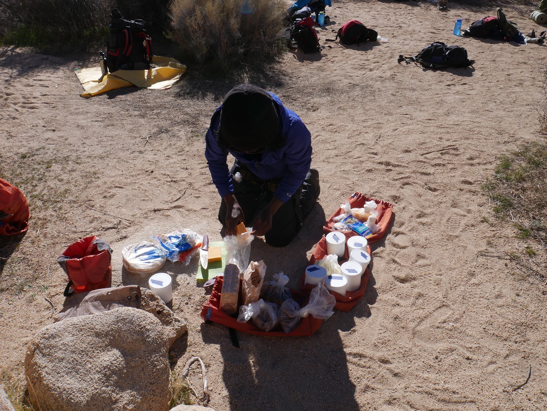Edgar — The morning of our third day we got the opportunity to apply packing techniques. Only ten minutes behind schedule, we made our way to the meeting point. I felt a bit more comfortable on this hike despite the added incline. My body was beginning to adjust all on its own. It was another story for the rookies in our group who struggled to keep a steady pace. I saw how quickly we formed support networks within our group. We were all lifting each other up, and it all happened so organically. I realized that hierarchies and roles can serve to limit us. While they do provide guidelines for specific tasks and duties that need to be accomplished, we must not cling to them, and they should not define us or our experience. Due to the government shutdown, it had been unclear whether we would be allowed to continue the course, but we got word that we had obtained special permission to stay inside the park. Waves of excitement permeated all over my body and a grin spread across my face. I wanted to head out to the second site ASAP, but we had to restock food and water first. After making sure we had everything we needed, we ate a quick lunch and prepared to hike out. The lack of quality sleep and the stress of the desert were taking a toll. Although I was reaching my limit physically, the surrounding Joshua Tree forest and rock formations filled me with awe and wonder. I thought about the adventures still awaiting me and moved forward with steady determination.