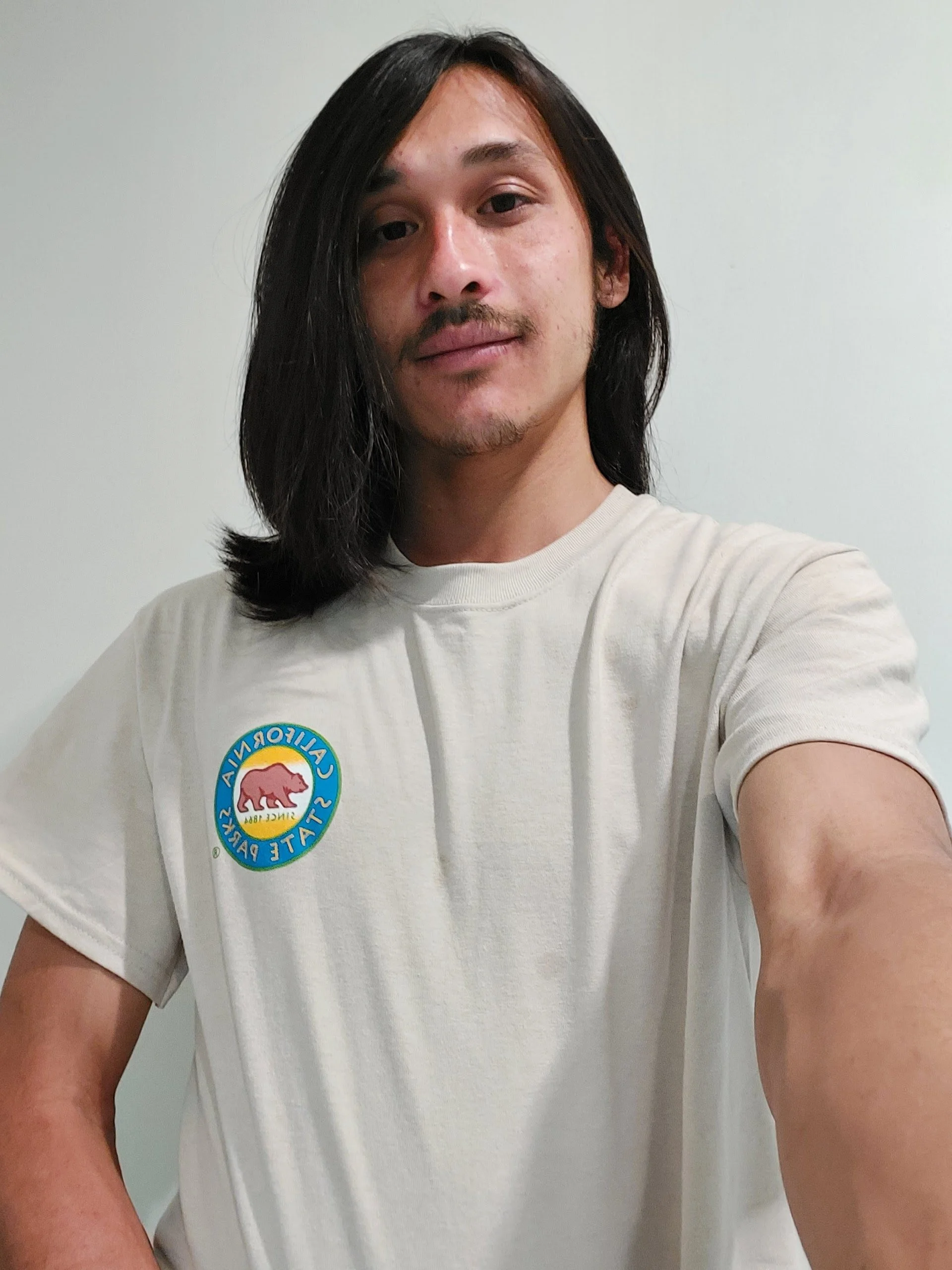 Sam Mah is showing off his California State Park shirt, as part of the uniform he is getting for his first week at the Los Angeles State Historic Park.